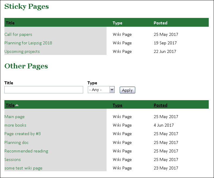 Sticky pages: The pink pages above are “sticky pages.” This means that the page appears at the top of lists. When you are editing a wiki page, under the “Publishing options” tab there is a checkbox called “Sticky at the top of lists” that enables sticky pages.
