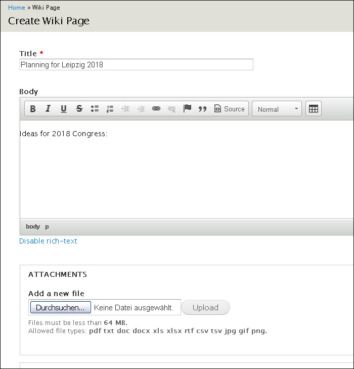 Adding files: You can add files while editing a page. Look for the section “File attachments” below the main text editing area and upload the file.