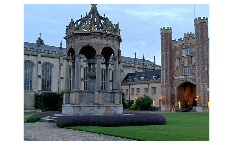 Konferenssin avajaiset ovat perinteisesti sunnuntai-iltana. Cambridgen kesäsää oli vaihteleva, sunnuntai tihkusateinen ja iltaa kohti sade vain yltyi. Sateessa lompsimme keskustan halki, välillä piti pysähtyä johonkin ovisyvennykseen kun vettä tuli taivaan täydeltä. Trinity Collegen vaatimattoman näköisen sisäänkäynnin eteen oli kerääntynyt IAML:ilaisista näyttäviä ja hetken vallitsi tyypillinen epätietoisuus. Onko tämä oikea paikka. Joku sitten avasi suuren puuoven, josta päästiin ns. vahtimestareiden (porters) huoneeseen. Parin sisäpihan halki kuljettiin edelleen sateessa avajaisten tapahtumapaikalle, katetulle (sentään) pylväskäytävälle.