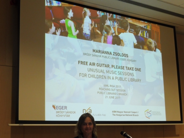 Majd következtem én: Free air guitar, please take one : unusual music sessions for children in a public library címmel tartottam egy nagyon jó hangulatú előadást az egri Bródy Sándor Könyvtárban megvalósuló rendhagyó foglalkozásaimról, melynek célja a gyerekek és tinik megismertetése a könyvtárral, valamint a zene közelebb hozása. Bemutattam röviden Egert, a Bródy Sándor Könyvtárat, majd a Zenei és idegen nyelvi gyűjteményt. Átadtam kollégáim és a Kemény Ferenc Sportiskolai Általános Iskola kisdiákjainak üdvözletét, aki rendszeres látogatói foglalkozásainknak, a jelenlévők imádták ezt a fotót.