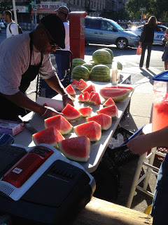 Vi bjöds på en svalkande melonbit under promenaden i Harlem